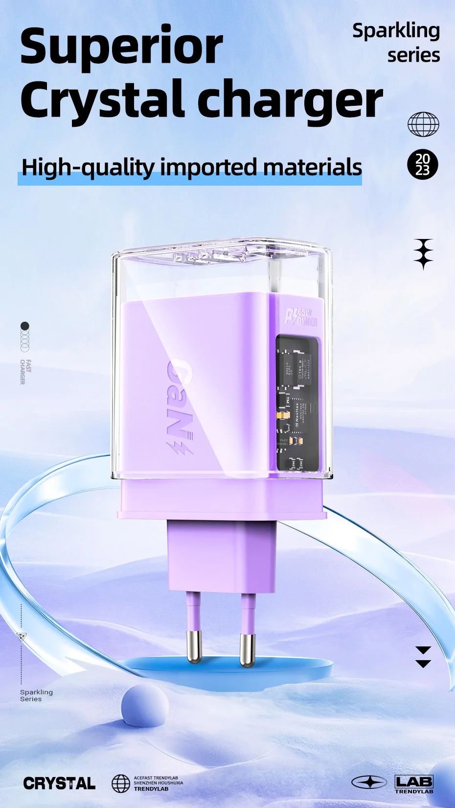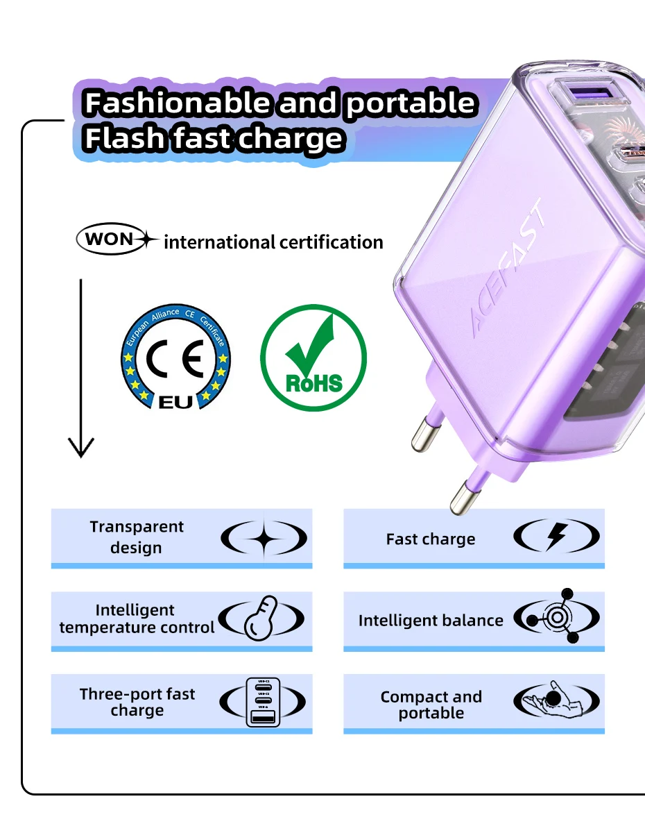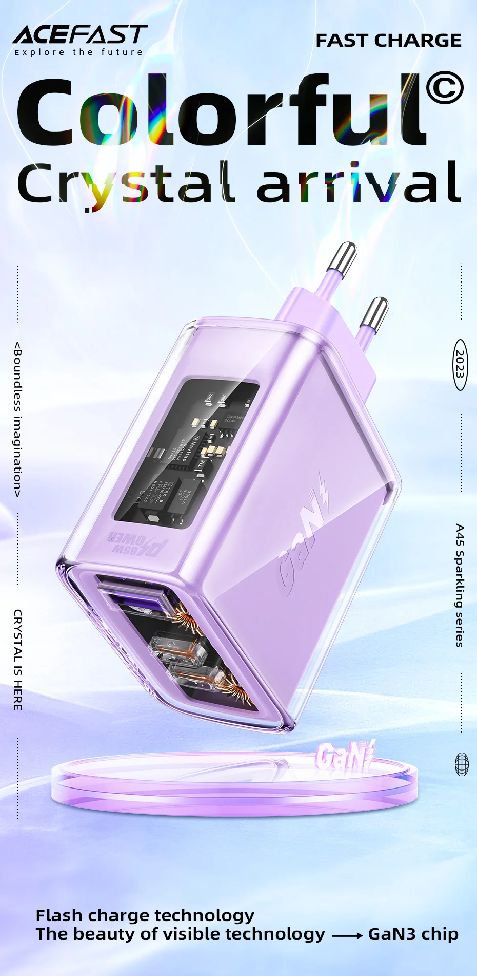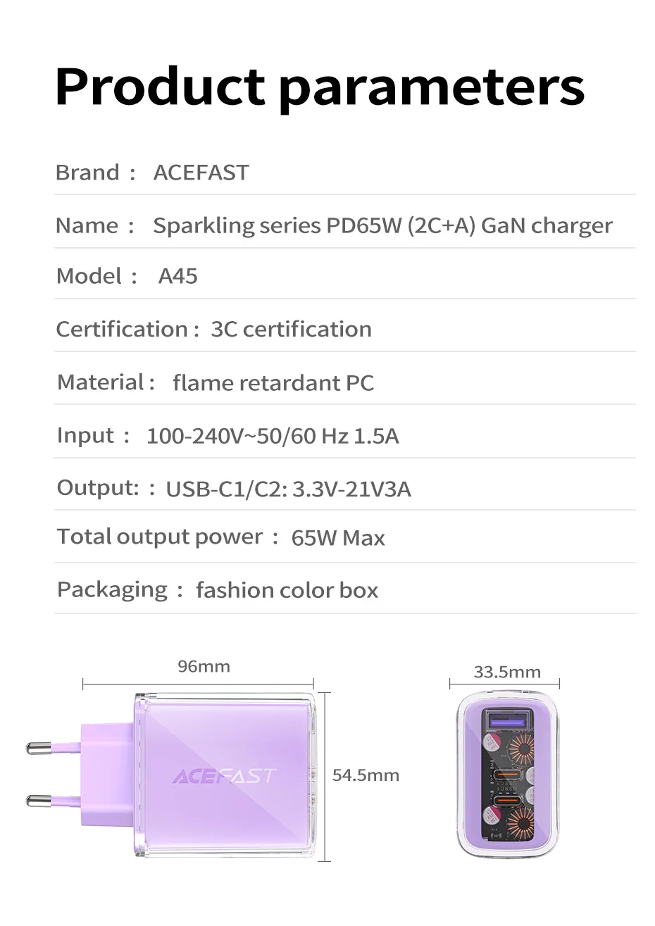 A45 Crystal Gan3 65W EU Fast Charging Charger for Iphone 15/14/13/12 USB C PD3.0 Quick Charge Adapter for Macbook Laptop